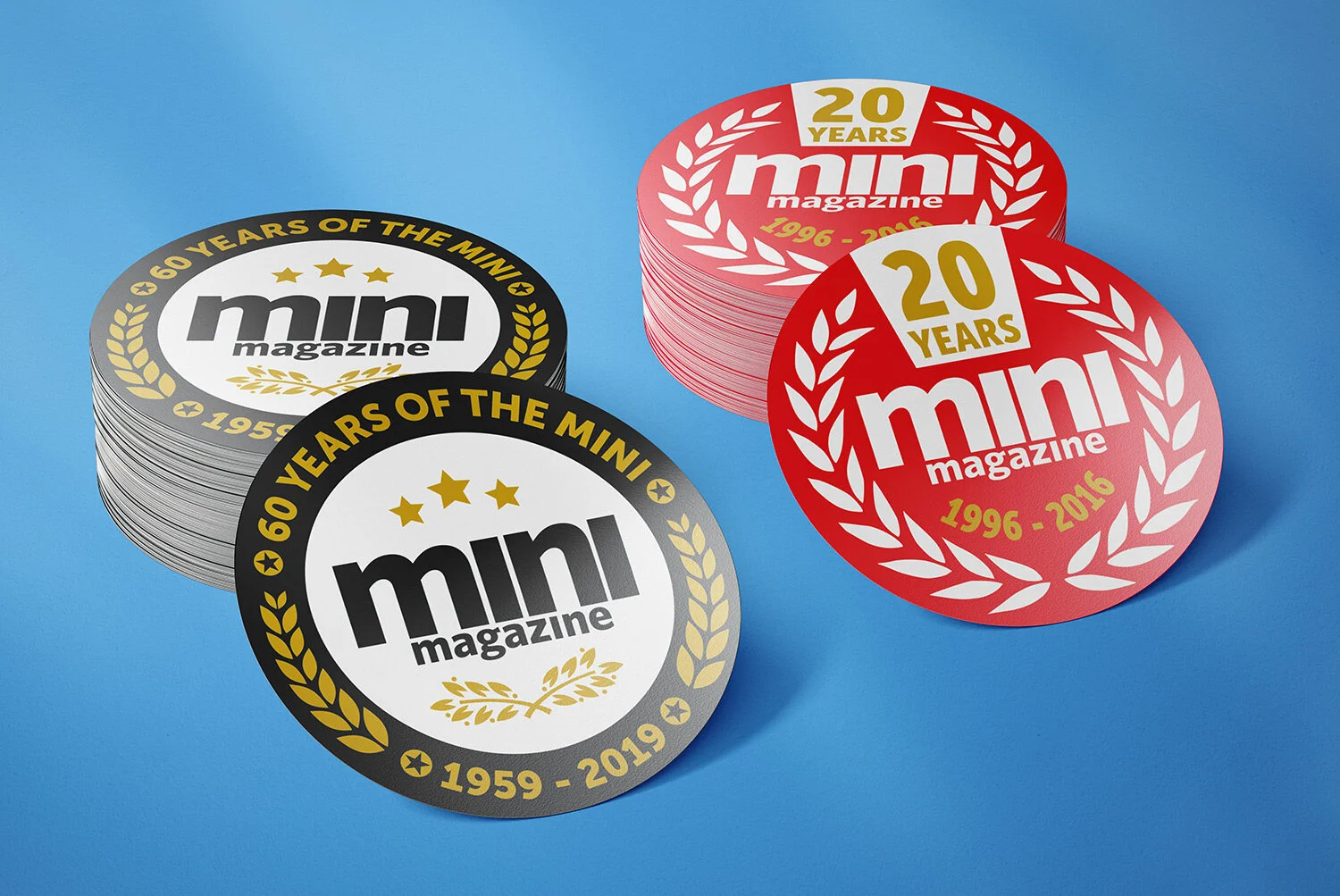 Vinyl Badges: A selection of vinyl badges that we designed inspired by the original iconic Mini Cooper decal.